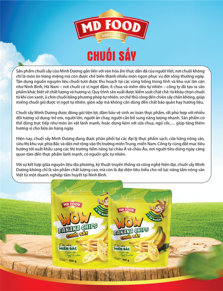 Từ sự gần gũi ấy, Công ty TNHH MTV Minh Dương (MDFood) đã tạo nên sản phẩm Chuối sấy MDFood – món ăn vặt mang hồn quê Việt nhưng được nâng tầm bằng quy trình sản xuất hiện đại, đảm bảo chất lượng và an toàn cho sức khỏe.